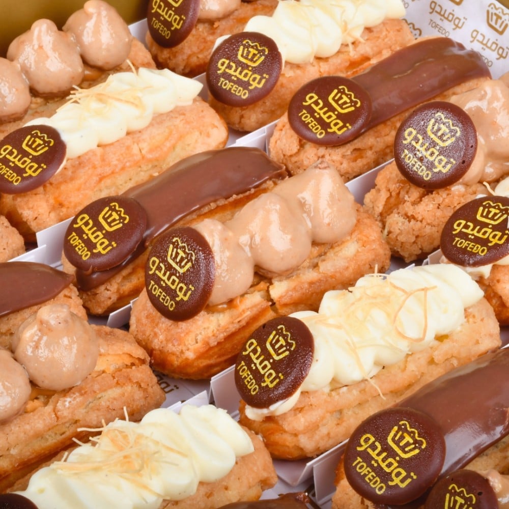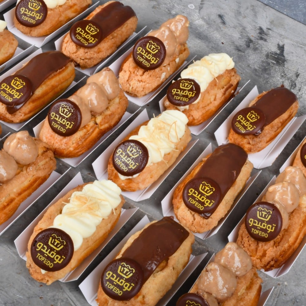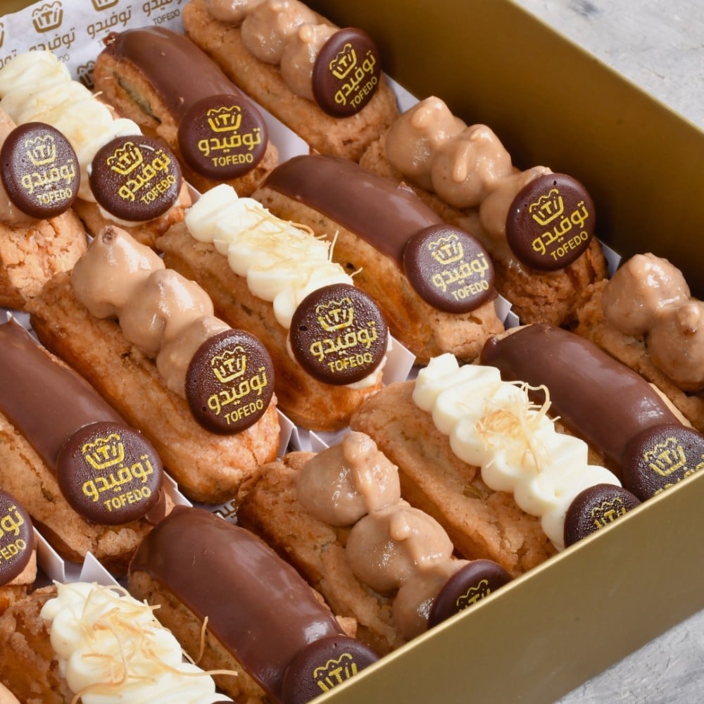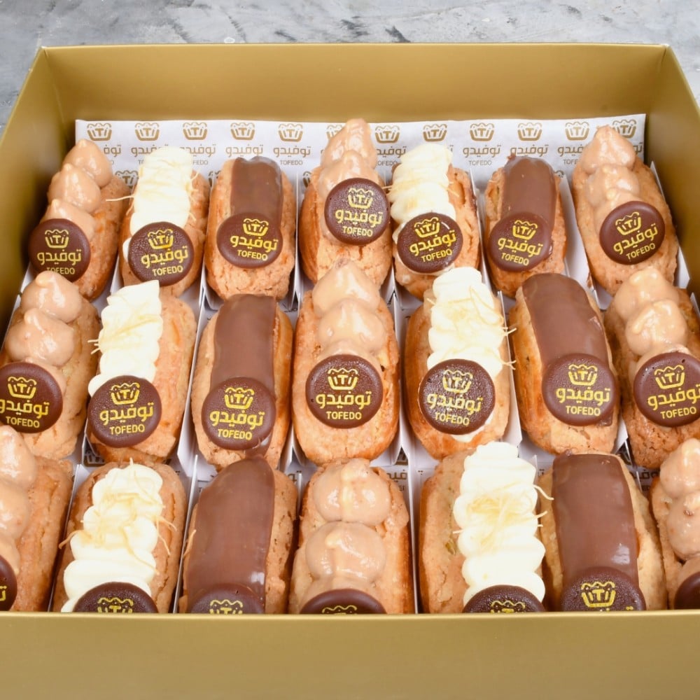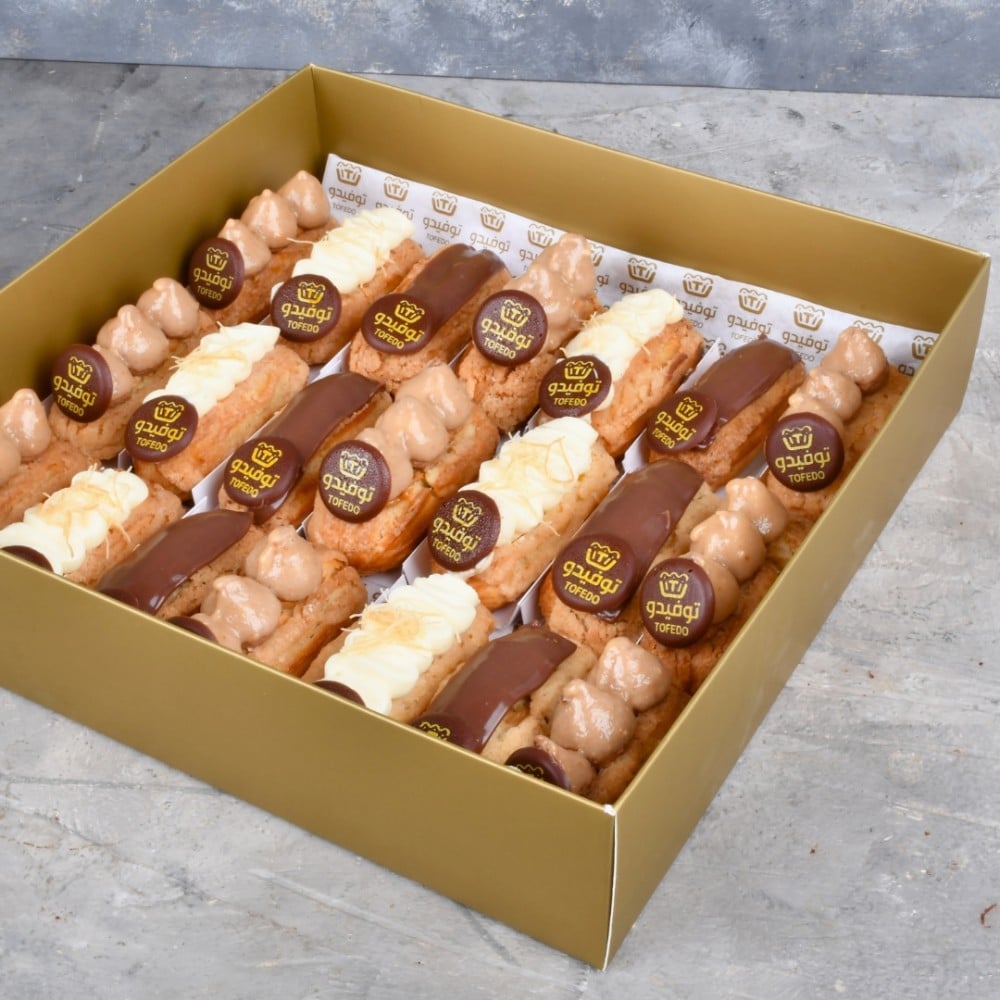 بوكس يحتوي على 21 قطعة او 14 قطعة من الاكلير المخبوز لدينا ومحشي بعدة حشواتاكلير الكر اميل بالدولشياكلير الفستق بالبراليناكلير الشوكلت بالبندق